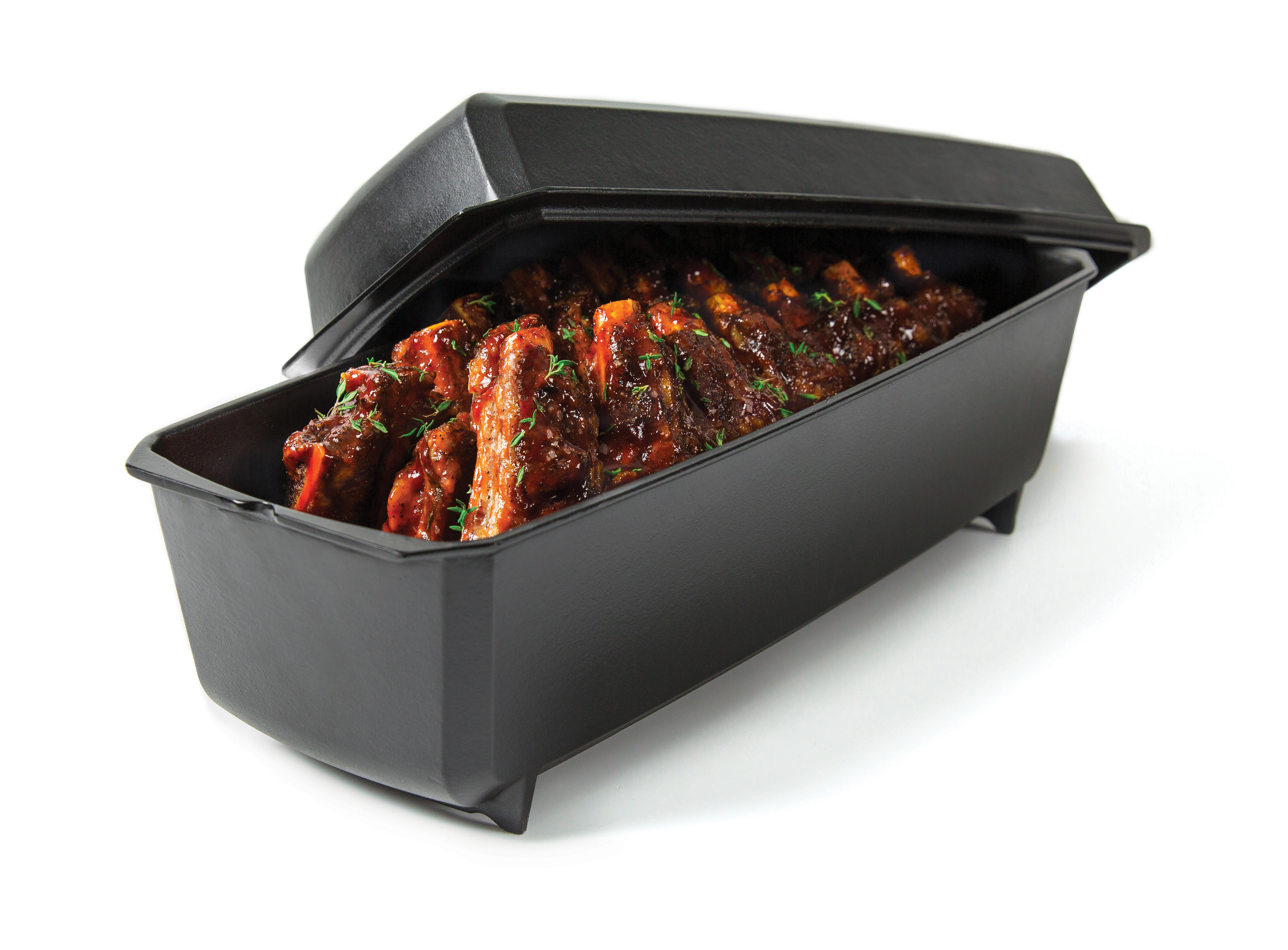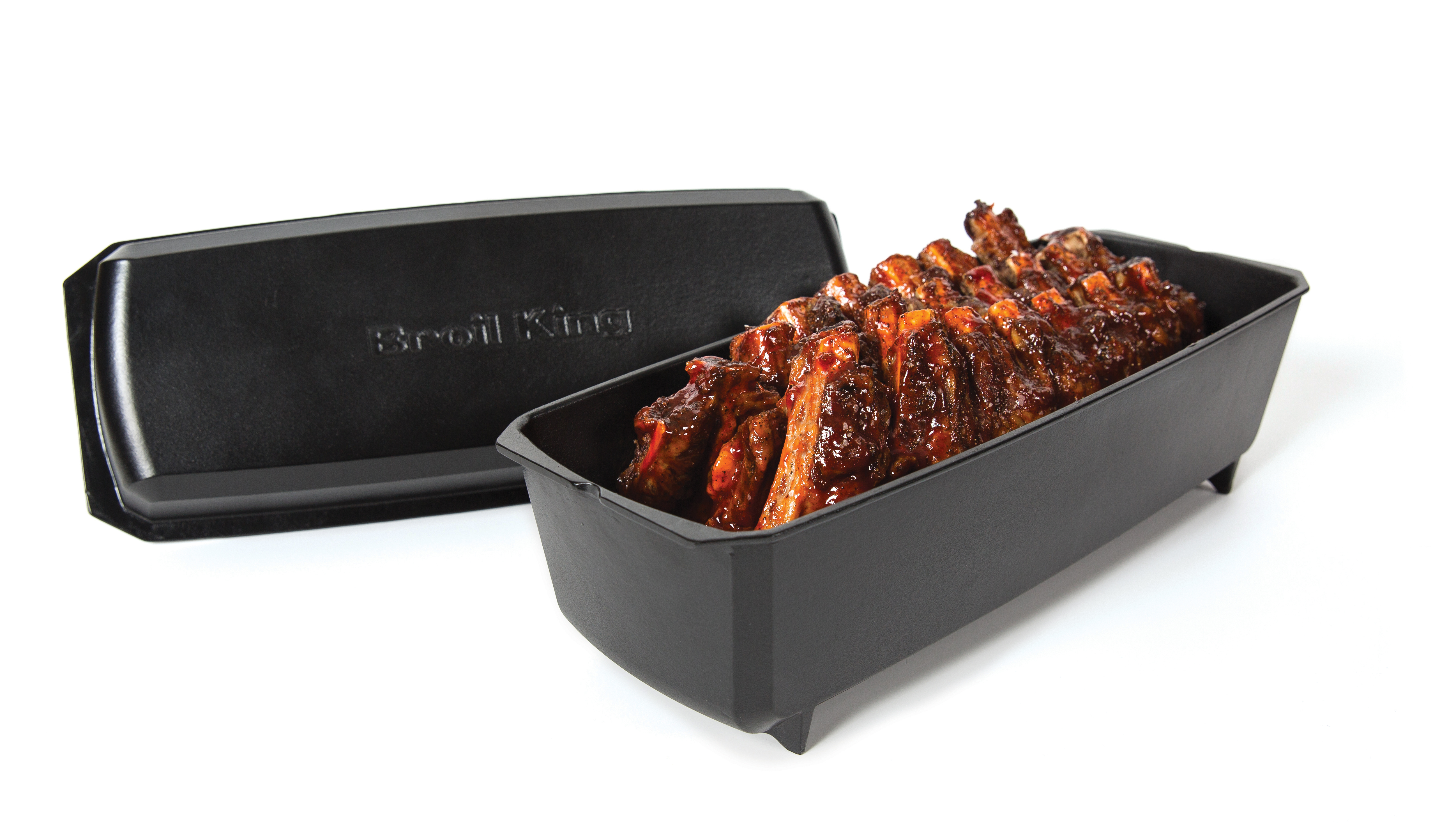 BroilKing Rotissoire à ribs 69615 Le rôtissoire en fonte est équipé d’un support à côtelettes, qui empêche la viande d’entrer en contact avec le fond du plat. Conçue pour reposer directement sur la grille ou sur le Flav-R-Wave